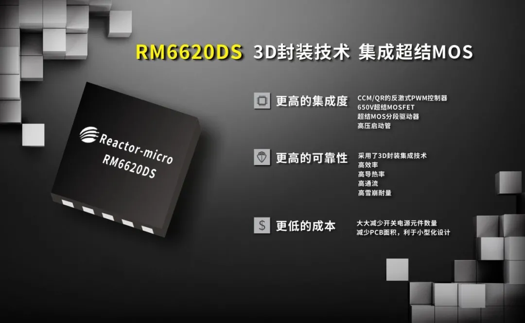 亚成微电子推出了一款高集成度的电源管理芯片RM6620DS,芯片采用行业领先的3D封装技术,内部集成了支持CCM/QR的反激式PWM控制器、650V超结MOSFET、超结MOS分段驱动器以及高压启动管,最大输出功率120W,具有高效率、高导热率、高通流、高雪崩耐量等特点。