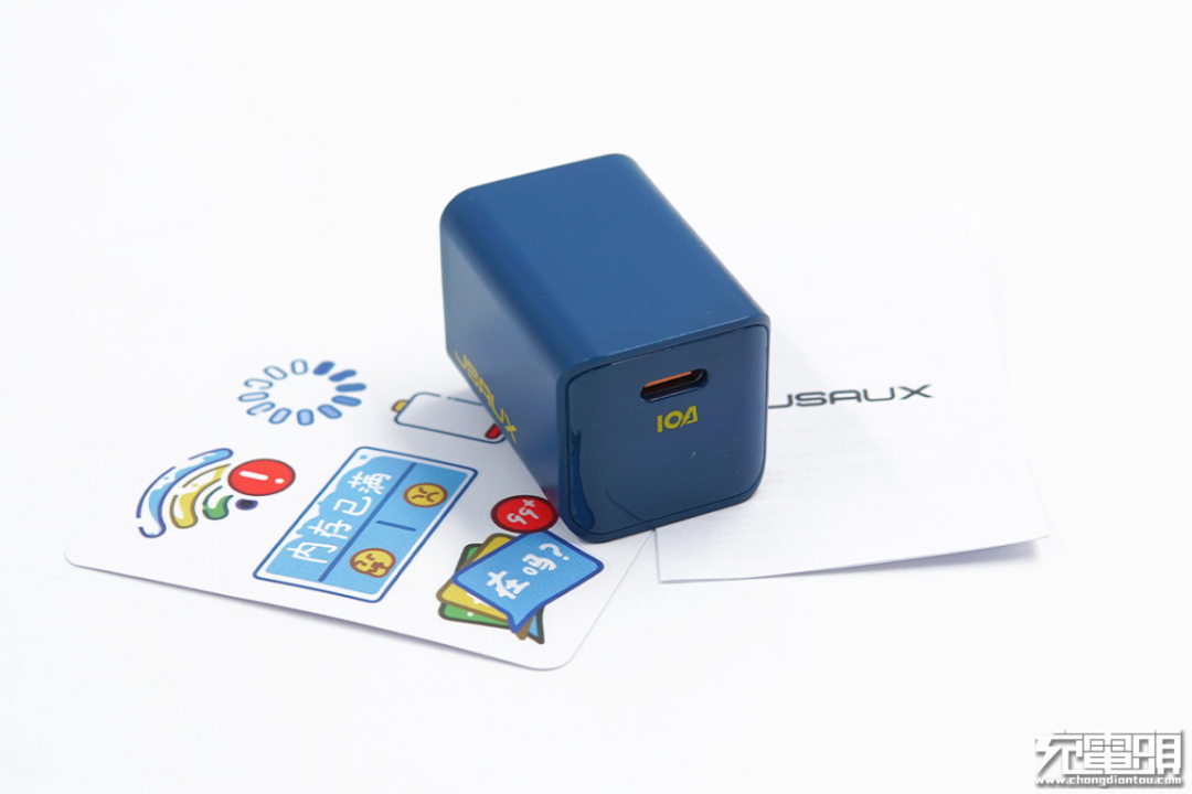JSAUX 20W PD快充充电器采用海蓝色配色,腰身磨砂顶面亮面处理,同时顶面边缘是尖锐棱边与平缓弧面结合设计,造型上有自己独特的风格。此外也是当时众多20W PD快充充电器中唯一一款采用可折叠插脚的充电器,日常使用或携带外出都很方便。