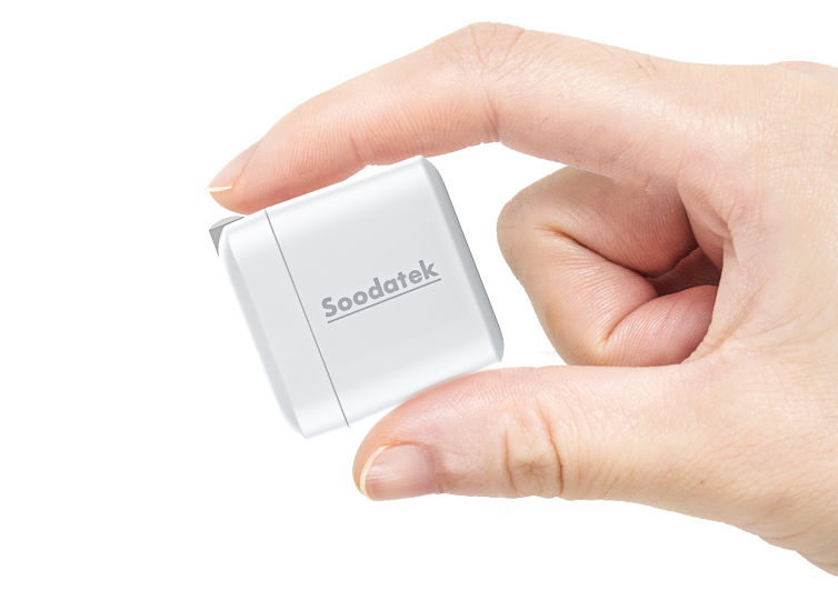 Soodatek 20W PD快充充电器三围尺寸约为36 * 38 * 40mm,与苹果5W充电器接近,体积相当小巧。而且采用可折叠插脚,方便外出携带。