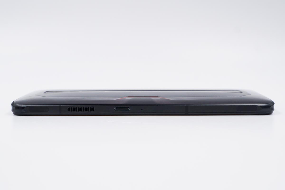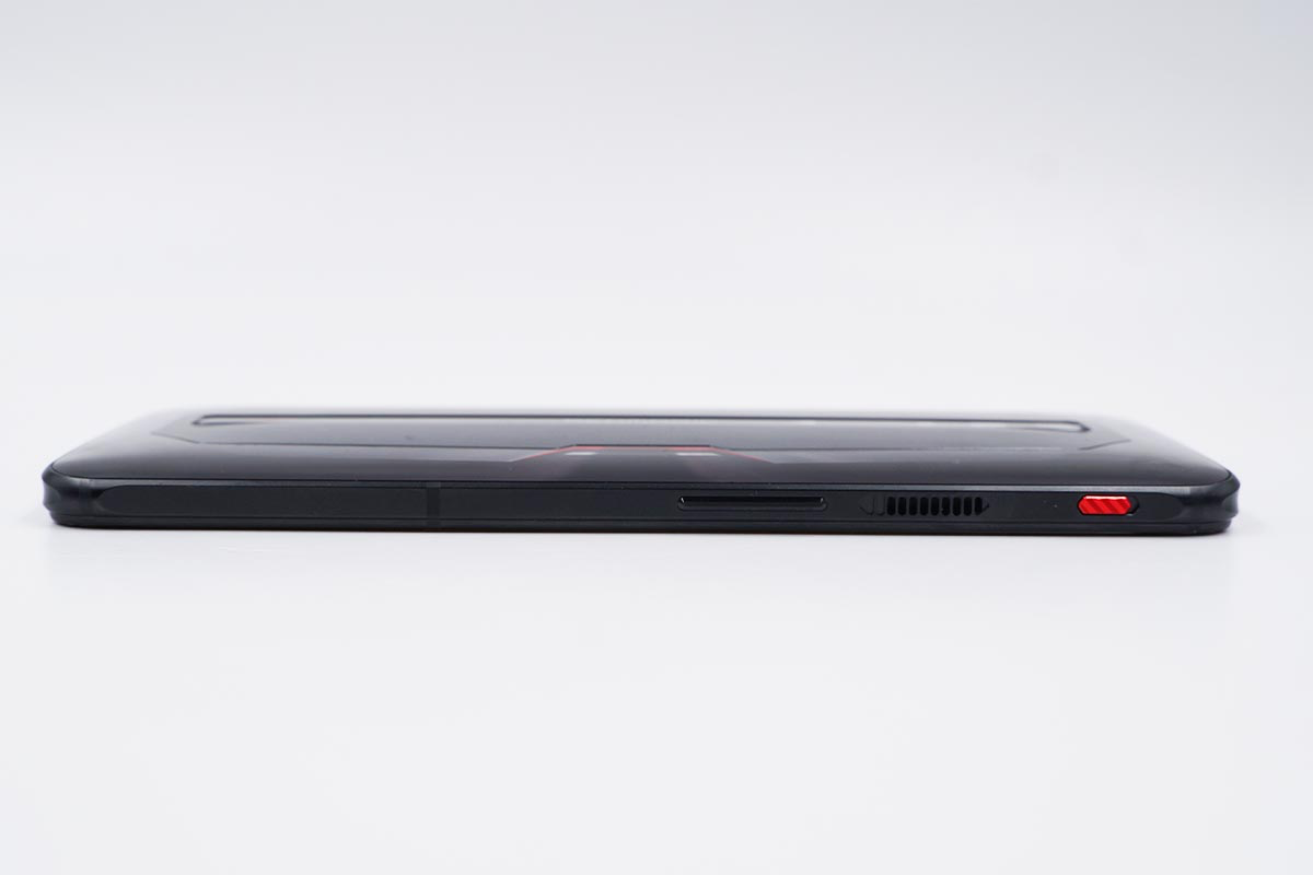 手机的右侧,两侧为游戏的肩键,其他的配置分别为风扇散热出风口和电源按键以及麦克风。