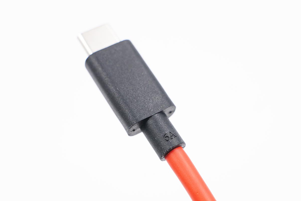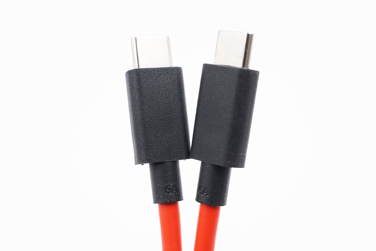 包装盒的充电套装除了120W氮化镓充电器之外还配备了一条双USB-C的快充线,线材为红色线身,端子头为黑色。