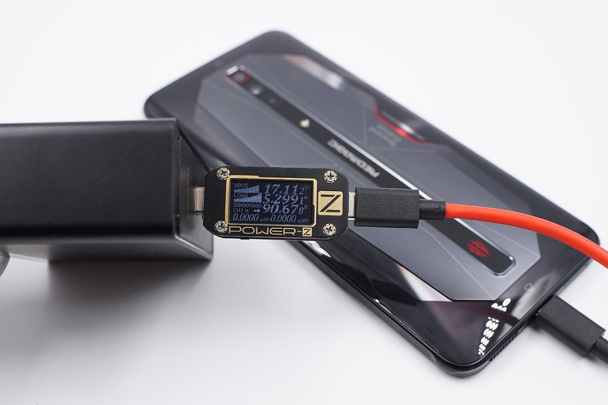 使用原装充电套装为腾讯红魔6 Pro充电,功率为17.11V 5.29A 90.67W,成功触发120W快充。