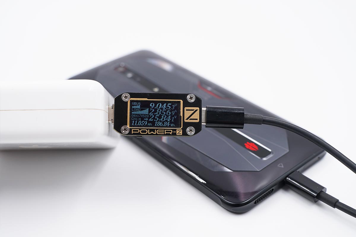 使用苹果96W充电器为腾讯红魔6 Pro充电,功率为9.04V 2.85A 25.84W,苹果96W充电器可以为腾讯红魔6 Pro提供27W PD快充。