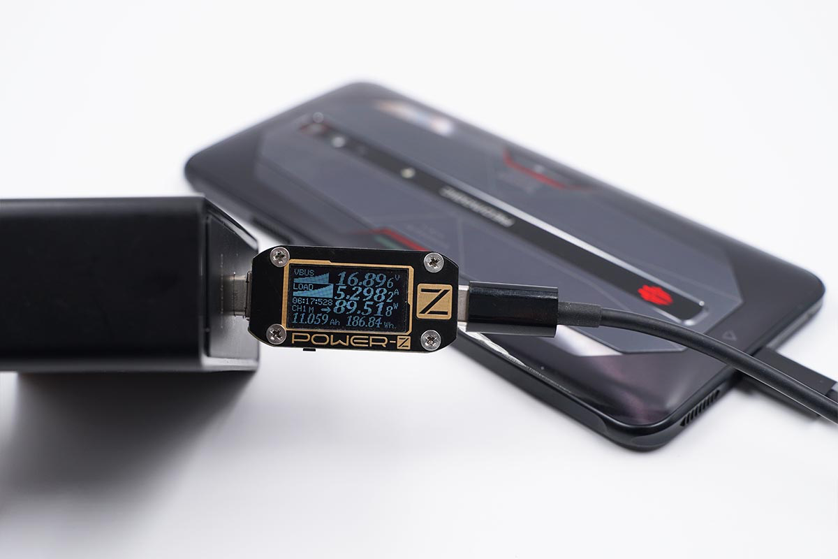 使用麦多多100W氮化镓充电器为腾讯红魔6 Pro充电,功率为16.89V 5.29A 89.51W成功触发120W快充。