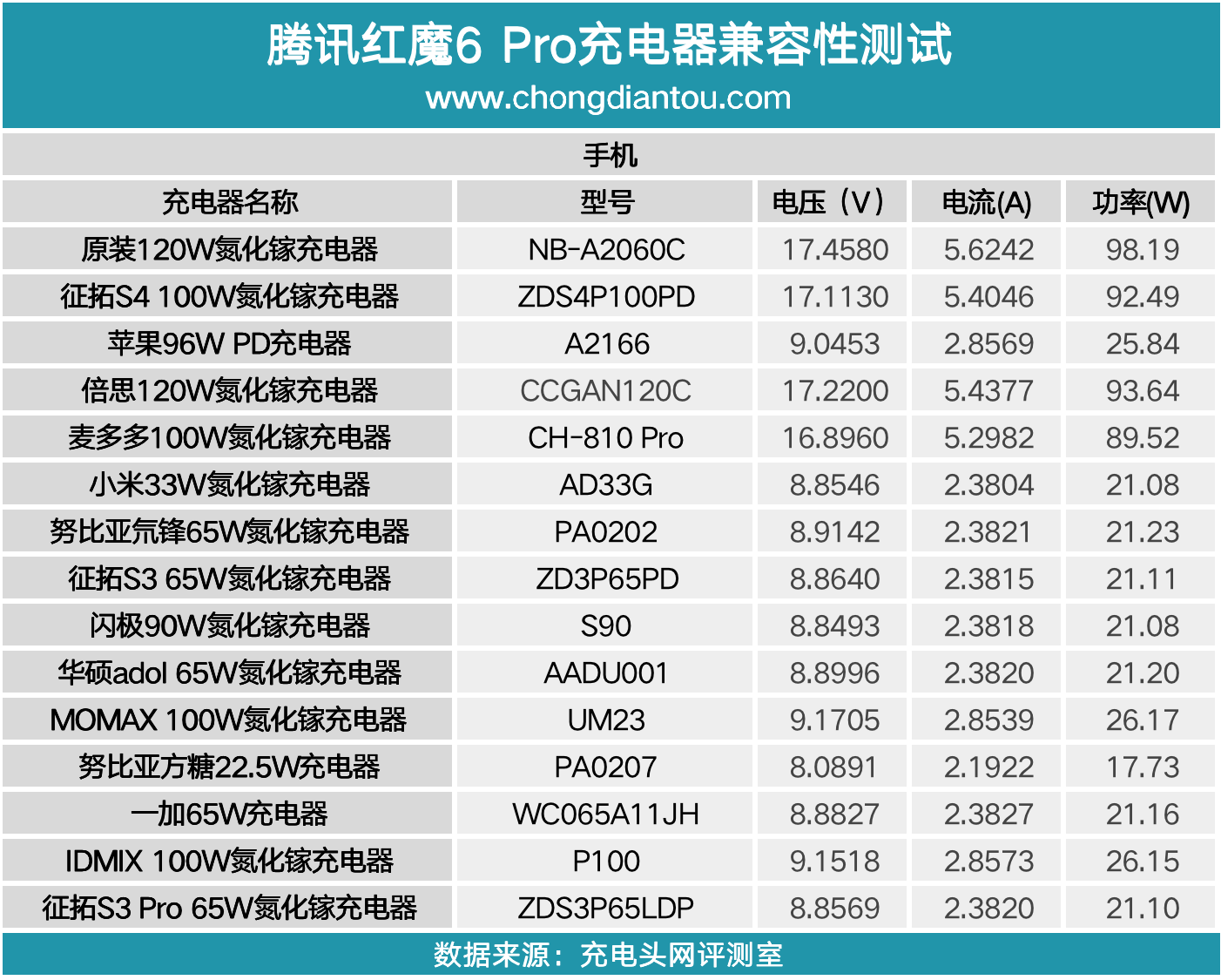 在测试了部分充电器之后发现部分支持百瓦输出功率且支持PPS快充的充电器可以为腾讯红魔6 Pro提供百瓦的快充,剩下的几款65W或低功率的氮化镓充电器以及仅PD快充的充电器则可以提供9V3A快充。