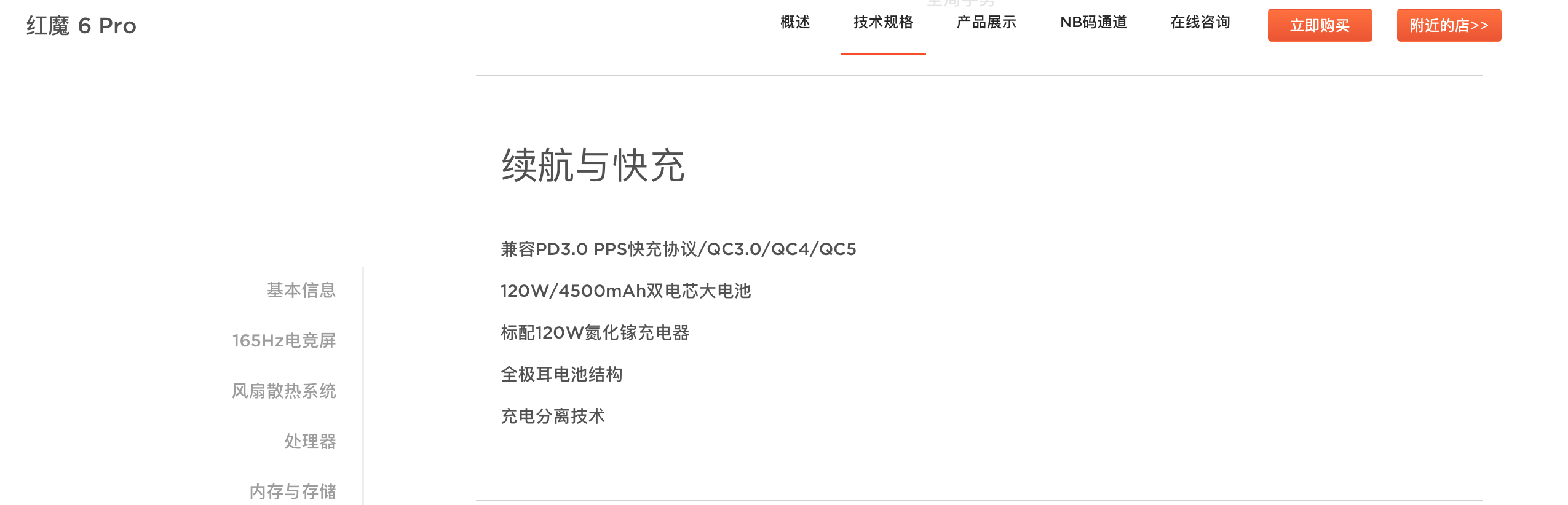 从努比亚官网上查询到腾讯红魔6 Pro采用了全极耳电池结构,并且内置4500mAh的双电芯,在一系列条件的基础上才得以实现腾讯红魔6 Pro支持120W快充的。