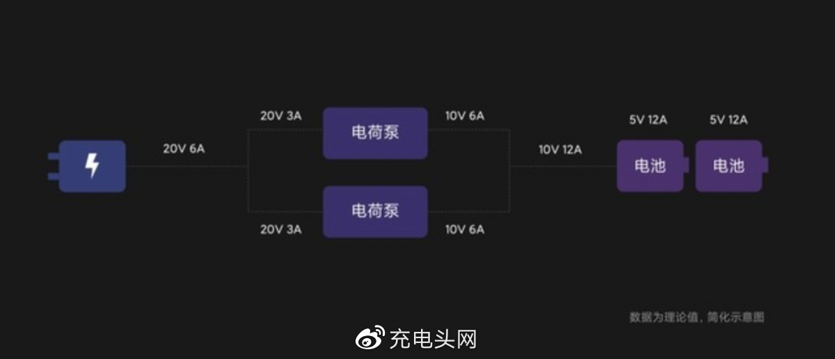 笔者这里用一张简图说明一下充电器端输出的20V 6A 120W的大功率是如何安全稳定进入到手机的。充电器端输出20V6A快充档位,经双路电荷泵将20V6A转化成10V12A为两块电池同时充电,这样每块电池所承受的充电为5V12A,相较于锂电池的3.7V电压的压差很小。一系列的转化之后才使得20V6A的快充成功为电池充电且发热量不会很高。