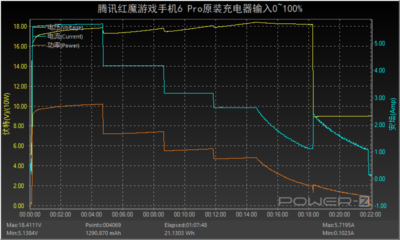 进入正题。使用原装充电套装为腾讯红魔6 Pro充电,前期可以很快的握手120W快充,功率在101W左右,持续了约4分43s。4分43s到8分39s之间功率在74W左右;8分39s到11分51s之间功率在57W左右;11分51s到14分39s之间功率在48W左右,随后功率和电流逐渐下降直至充电结束,全程耗时约21分。最高功率为17.84V 5.71A 102.04W。