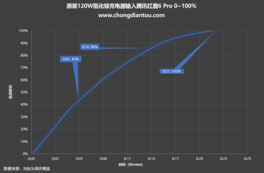将整个测试过程绘制成曲线图,从曲线图中可以看出,腾讯红魔6 Pro使用原装120W氮化镓充电器短短5分钟就充入了43%的电量,14分钟充电86%,完全充满仅需21分。