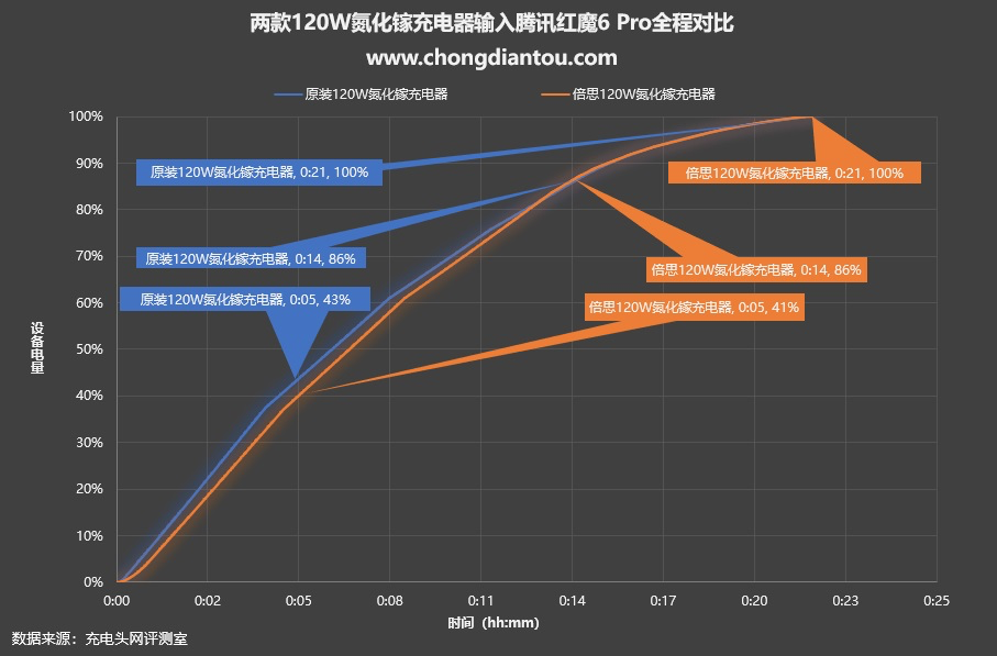 将倍思120W充电全程的数据汇总成曲线图并将两种曲线图做个对比,可以看出在前10分钟左右原装120W氮化镓充电器要比倍思120W氮化镓快一些,不过总时长均为21分,可见腾讯红魔6 Pro对于第三方的一些大功率充电器也可以有很好的兼容性。
