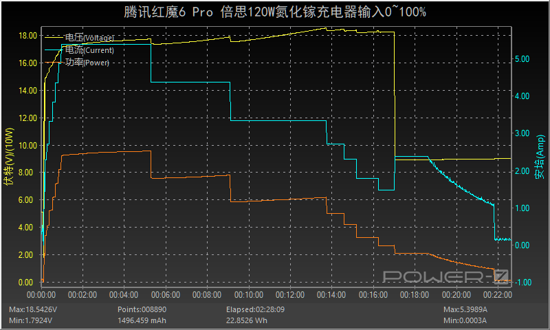 随后功率和电流呈阶梯式的下降状态。17分02s时电压从20V档位降至9V输入,功率在22W左右持续了约1分30s,随后功率和电流逐渐下降直至充电结束,全程耗时约21分51s,最高功率为17.72V 5.39A 95.66W。