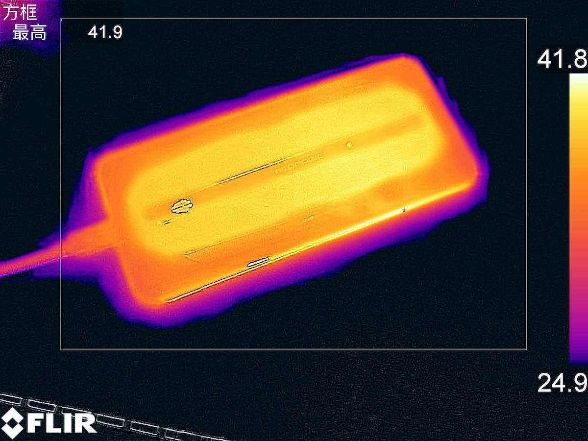 至于温度方面,由于充电全程仅耗时21分钟,所以笔者选择了两个时间点来进行温度采集,从全程的测试过程可以看到,整个充电过程前4分钟处于100W充电状态,到8分钟时功率在74W左右,笔者在4分43s和8分39s两个时间点对充电器和手机的温度进行了数据采集。