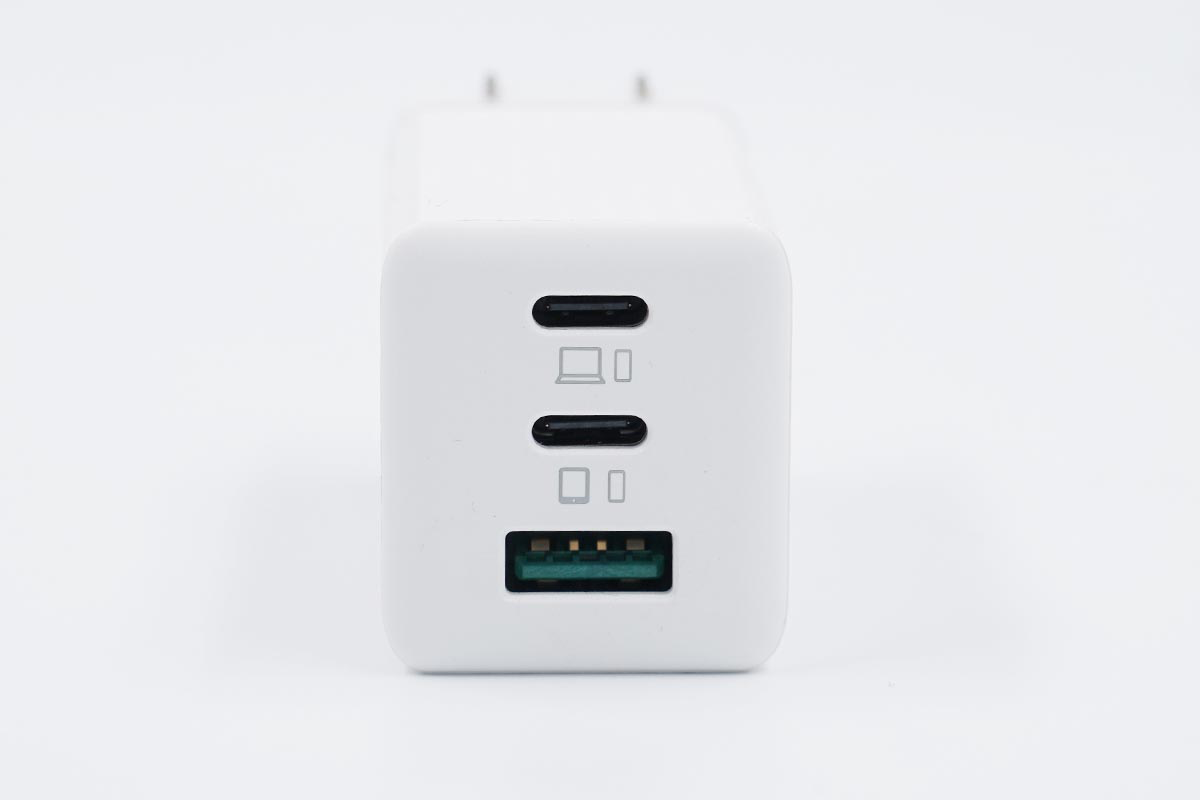 接口配置部分充电器采用了2C1A共3个USB充电接口的设计,也是目前65W氮化镓充电器主流的接口配置,既满足当前主流USB-C接口的使用同时也兼顾了老款USB-A充电线的使用。两个USB-C接口的底部丝印了笔电、苹果和手机的标识,意为推荐使用充电设备的类型。