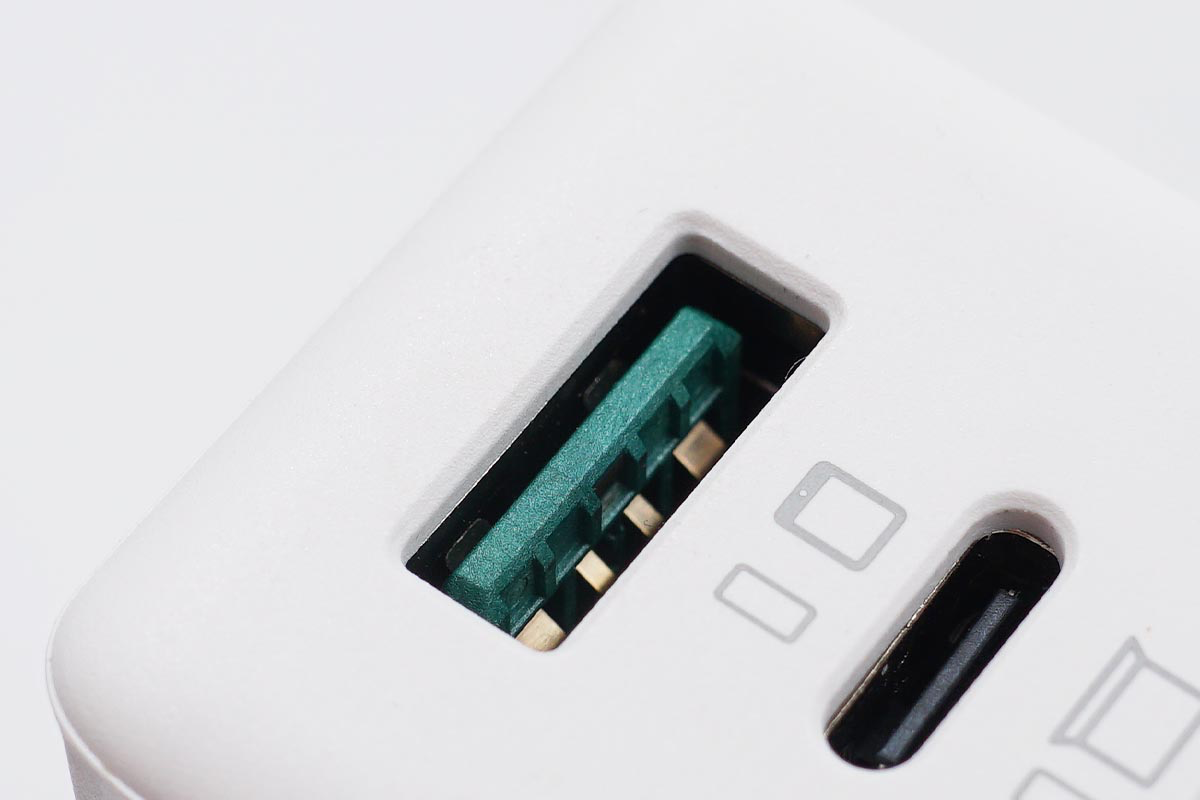 USB-A接口的内部为绿色胶芯,这一点和上一代S3相同,内部四颗弹片中两侧弹片加宽设计以便承载大电流的通过(为华为22.5W SCP快充准备),此外在胶芯的外侧还额外留有一个特殊的触点。