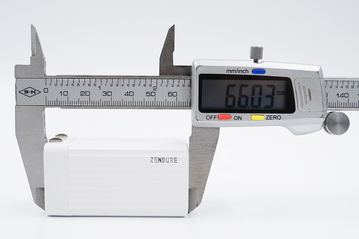使用卡尺实测充电器不算插脚的长度约为66.03mm。