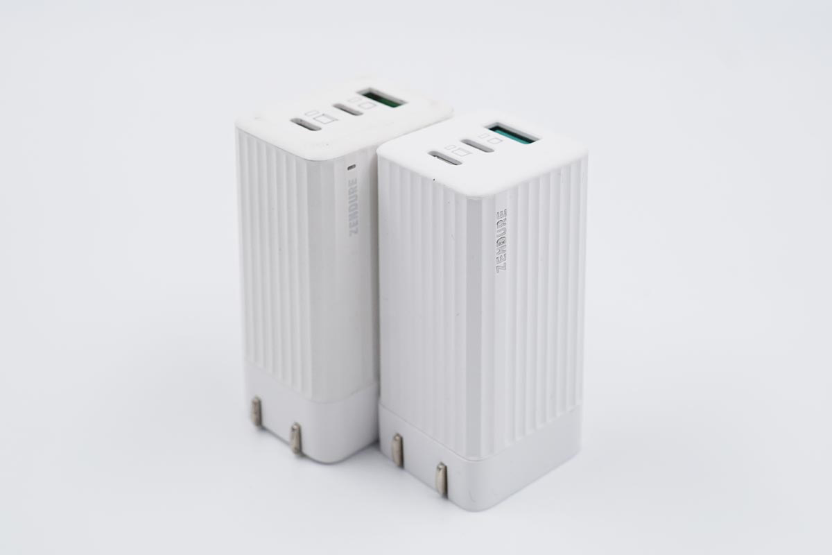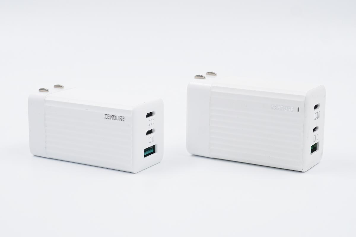 这两款均为征拓推出的65W多口氮化镓充电器,外观造型相同,纯白色的外观配色,右侧为征拓S3氮化镓充电器,左侧为最新推出的征拓S3二代氮化镓充电器。