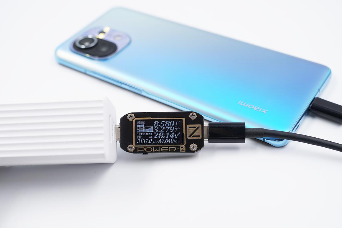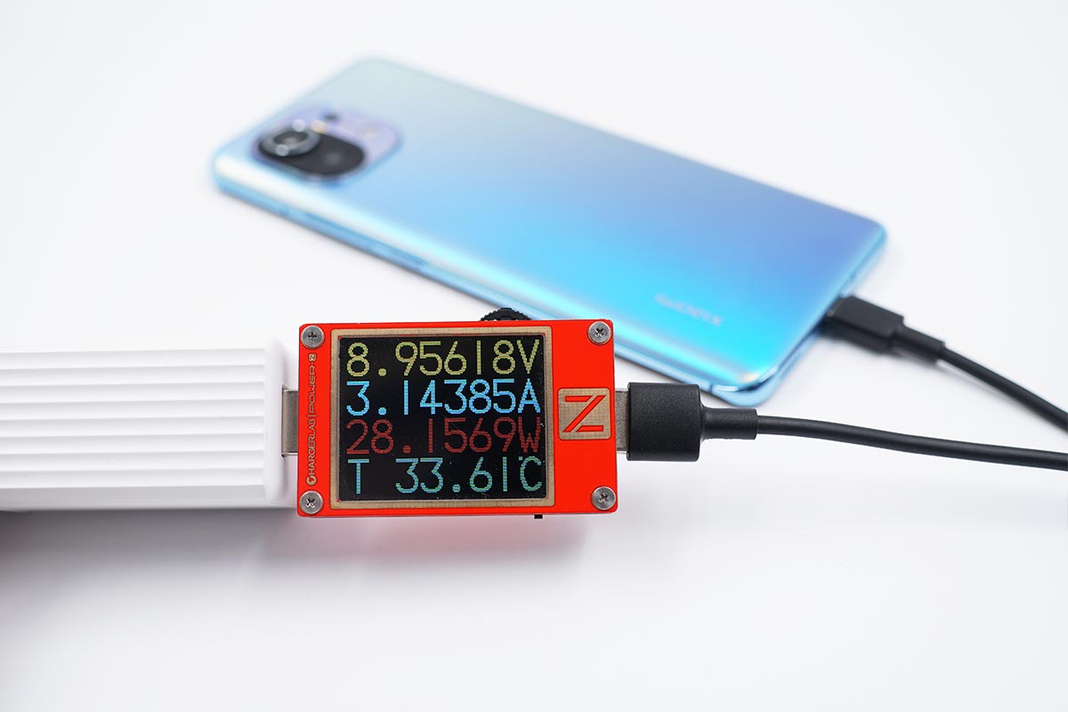 小米11支持PPS/QC/PD快充协议,使用USB-A为小米11充电,功率为8.95V 3.14A 28.15W。