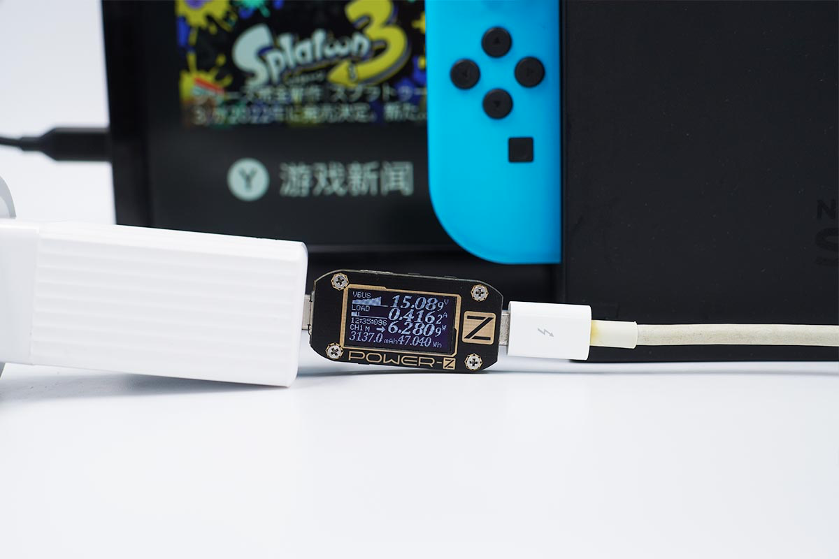 Switch带有特殊的底座TV模式,需要15V3A PDO才可以正常工作,非常挑充电设备。使用USB-C为Switch底座供电,功率为15.08V 0.41A 6.28W,成功握手底座TV模式,底座正常对显示屏输出HDMI信号。