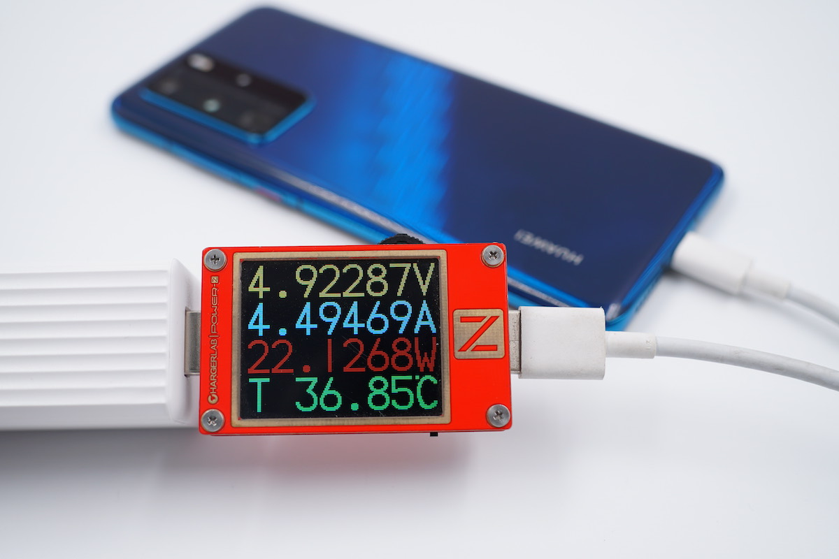 华为P40 Pro支持SCP/FCP/PD快充协议,使用USB-A为华为P40 Pro充电,功率为4.92V 4.49A 22.12W,此时处于SCP快充状态。