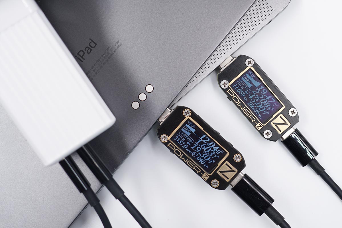 使用USB-C1为MacBook Pro充电,功率为43W,同时使用USB-C2为iPad Pro充电,功率为19.30W。充电器支持两个USB-C同时输出功率遵循45W+20W分配规则。