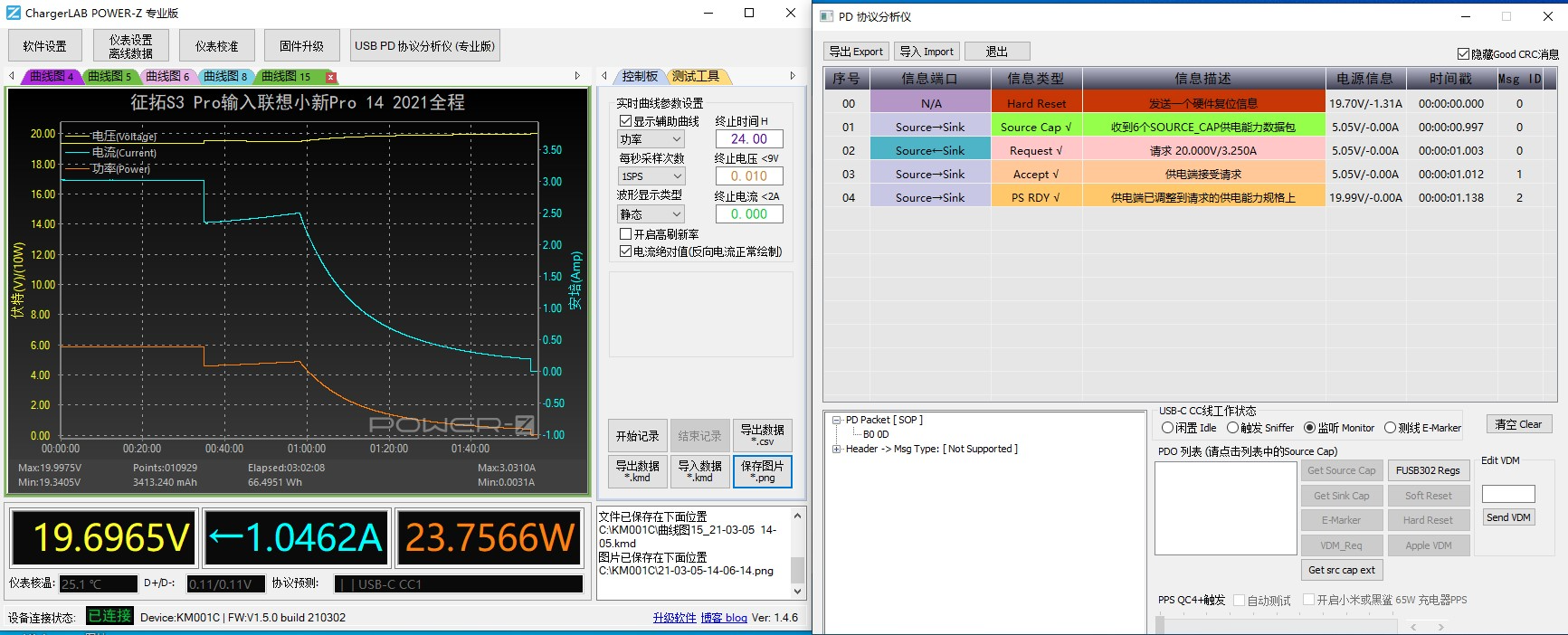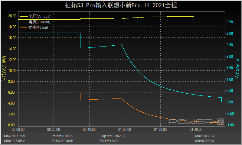 使用征拓S3二代氮化镓充电器为联想小新Pro14充电,连接上以后直接握手20V3.25A快充输入档位,35分前功率、电压、电流平台均持稳定的输入状态,功率在59W左右。随后功率降至48W左右,持续了约25分。随后功率和电流逐渐下降直至充电结束,全程耗时约1小时54分,最高功率为19.36V 3.02A 58.63W。