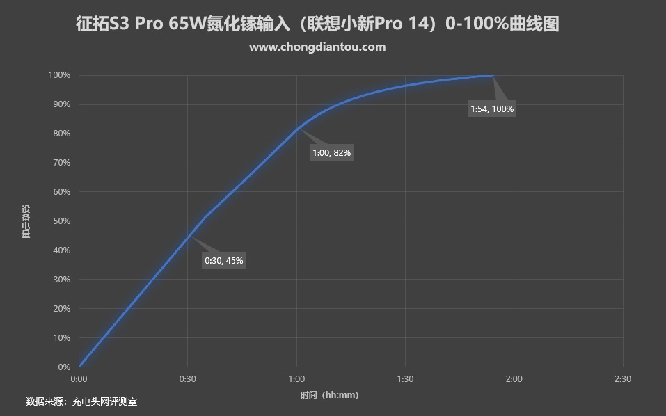 将整个充电过程绘制成曲线图,可以看到征拓S3二代氮化镓充电器半小时可以为联想小新Pro14充入45%的电量,1小时充电82%,完全充满需要1小时54分。