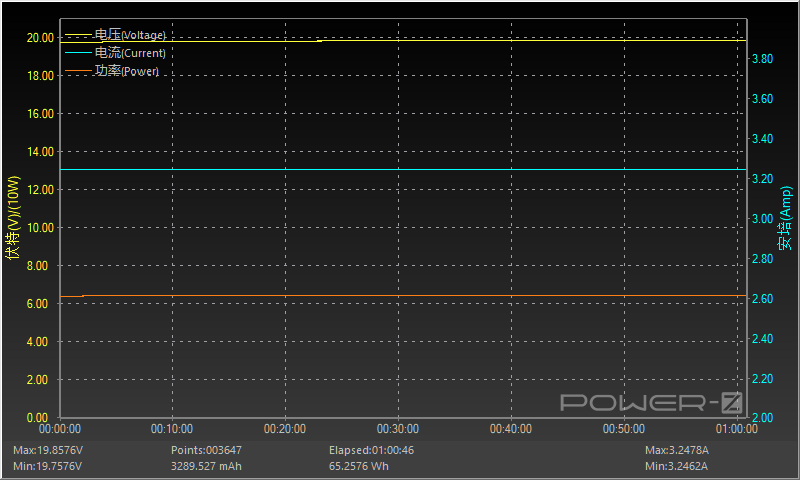 按照额定功率20V 3.25A 65W满载对充电器进行稳定性测试,测试时间为一小时,测试过程中电压值呈水平直线,无明显波动情况,长时间满载比较稳定。