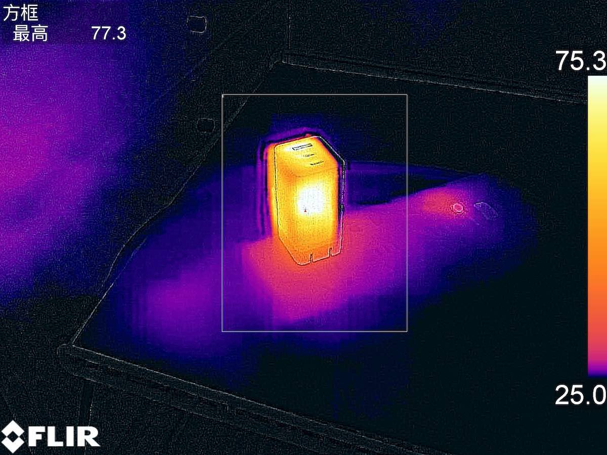 作为参照,满载一小时测试中,低功率密度的氮化镓充电器满载温度一般在60-70度之间,而高功率密度的单口氮化镓充电器一般在70度左右,高功率密度的多口氮化镓充电器温度一般都会超过70度。