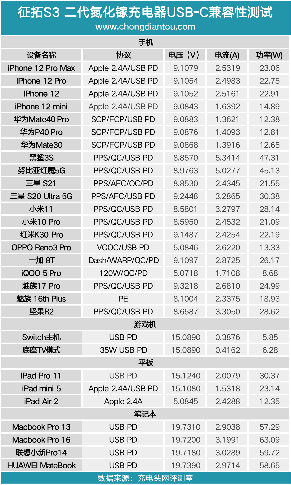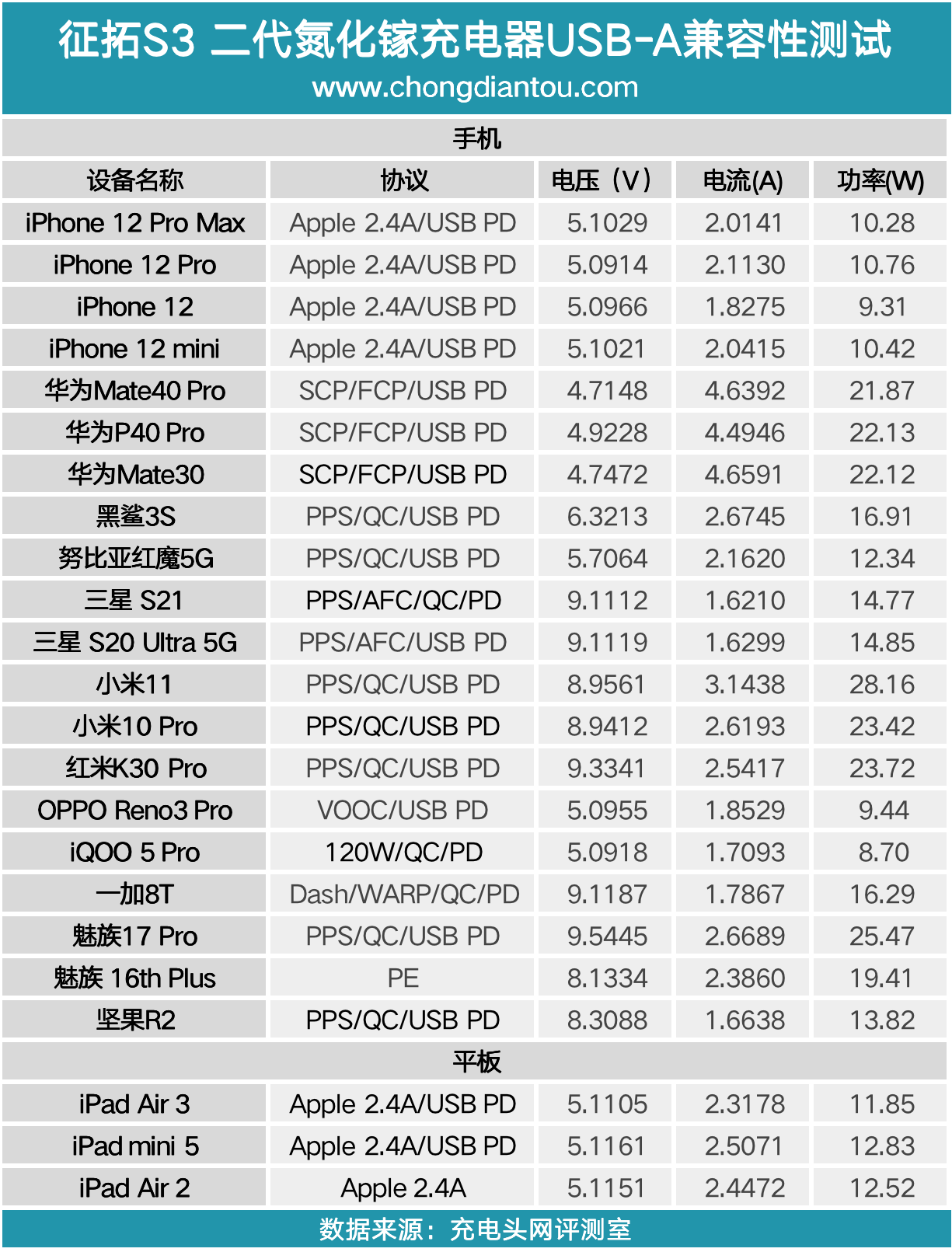将USB-A的测试数据汇总,从整体来看为大部分设备充电均可以触发相应的快充,对于华为手机则可以提供22.5W的SCP快充,USB-A支持PE快充协议,而对于小米系手机的充电功率则可以达到23W-28W左右,表现不错。