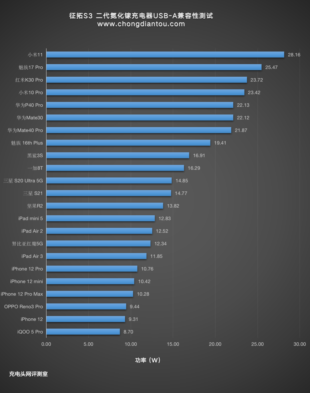 从柱状图上来看,排在第一的是小米11,功率达到了28.16W,其他设备的快充功率均处于正常水平,整体走向较为平缓。