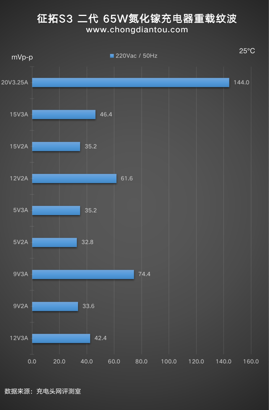 重载情况下:九个档位输出时纹波峰峰值从32.8mVp-p到144.0mVp-p不等。