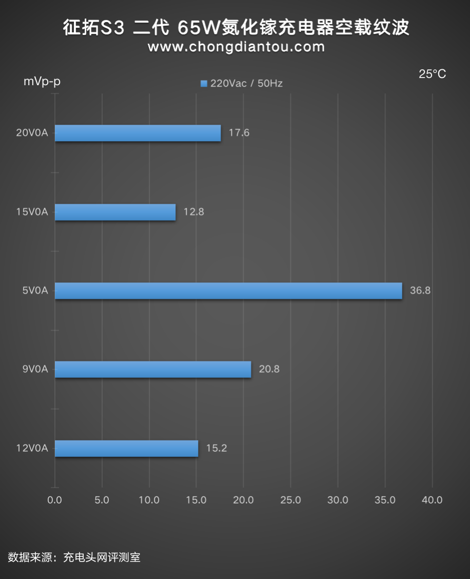 征拓65W 2C1A氮化镓充电器在220V 50Hz交流输入的情况下进行了空载与重载的纹波测试,测试结果如下: