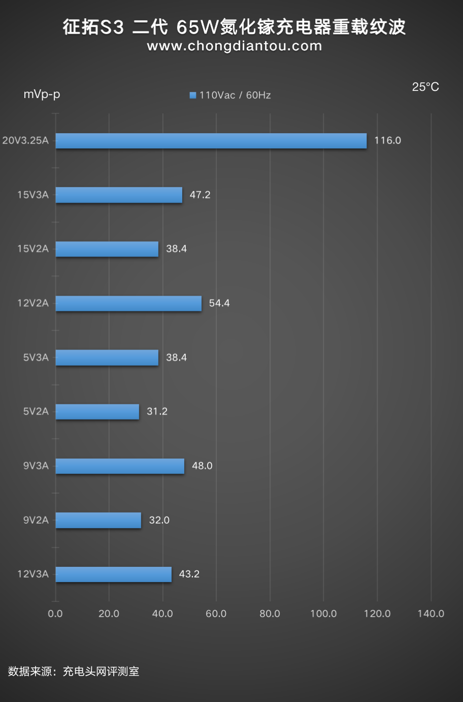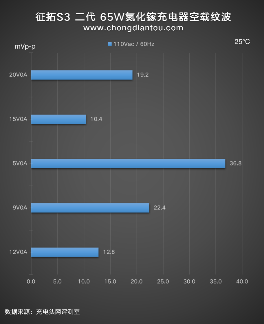国家标准中充电器纹波要求是不高于200mVp-p,征拓65W 2C1A氮化镓充电器在110V 60Hz、240V 50Hz输入电压下,所有输出功率纹波峰峰值均低于200mVp-p这个标准,表现不错。