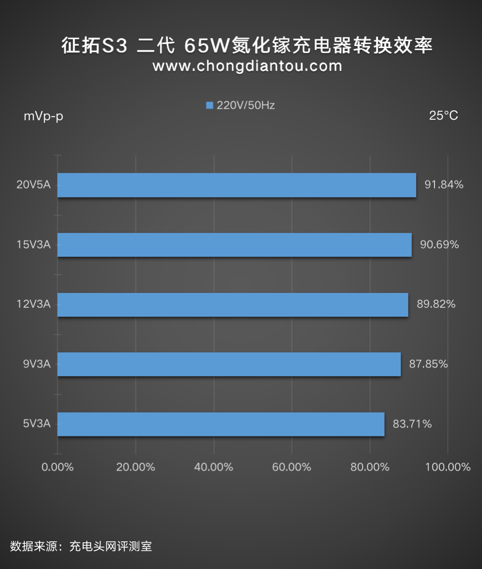 220V 50Hz下,将征拓65W 2C1A氮化镓充电器在各个电压档位的输出功率拉满进行测试:五个档位测得插线板AC端输入功率和USB端输出功率,通过计算,可得充电器的转换效率从83.71%到91.84%不等。
