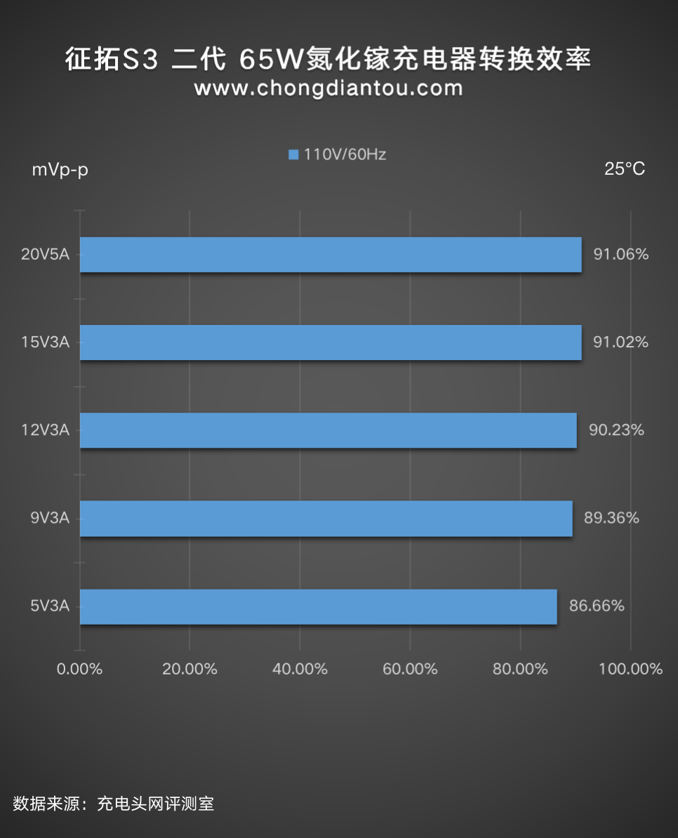 110V 60Hz下,充电器的转换效率从86.66%到91.06%不等。