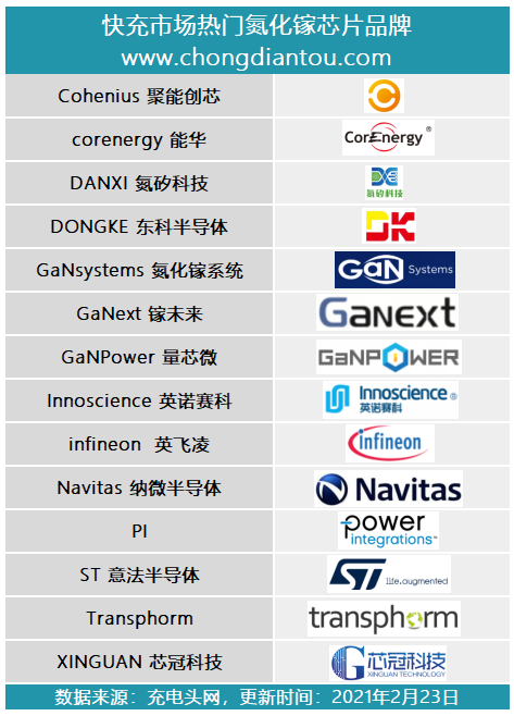 芯冠科技、能华等11家氮化镓快充功率器件供应商。