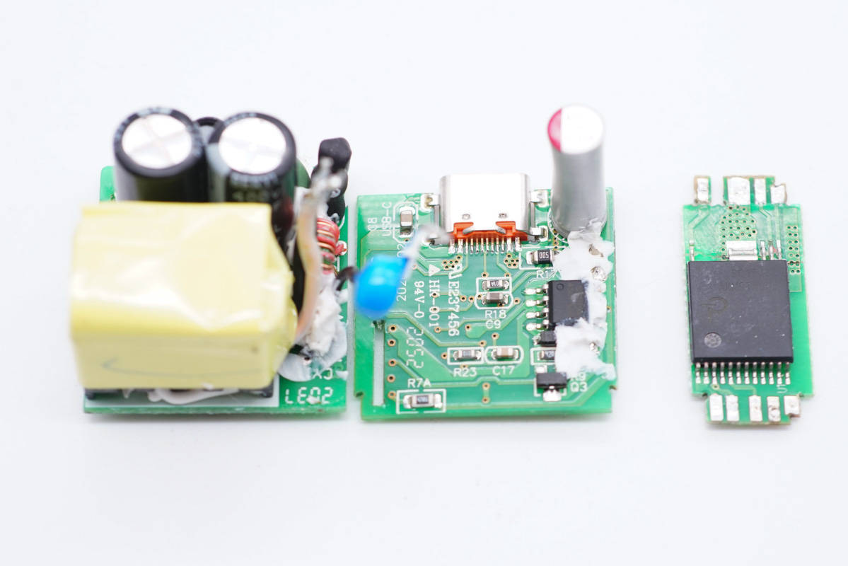 充电器采用3块小板组合焊接设计,U型结构,是时下迷你充主要设计方法,可以最大化利用内部空间。另外还采用了经典的开关电源宽范围输出,协议芯片通过光耦反馈控制输出电压架构,下面来详细了解各元器件的信息。