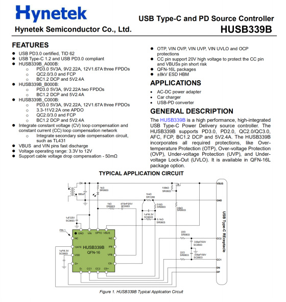 USB PD快充协议芯片来自慧能泰半导体,型号HUSB339B,该芯片已获得USB-IF协会PD3.0认证(TID:62),此外还可兼容PD2.0、QC2.0、QC3.0、AFC、FCP、BC1.2、Apple2.4A等多种充电协议,适用于20W PD旅充和车充等应用场合。