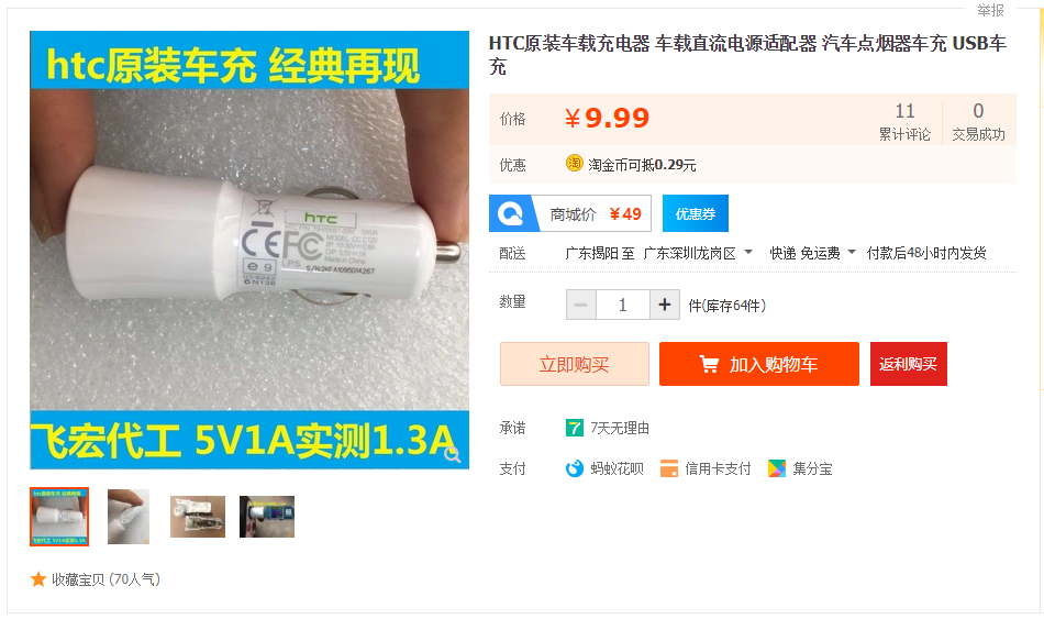 HTC这批车充由飞宏代工,质量稳定,支持苹果/安卓充电,输出为1A实测达到1.33A。外观经典,可以备用或收藏。