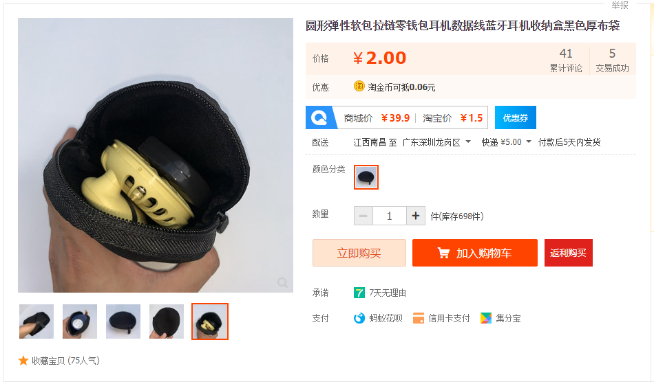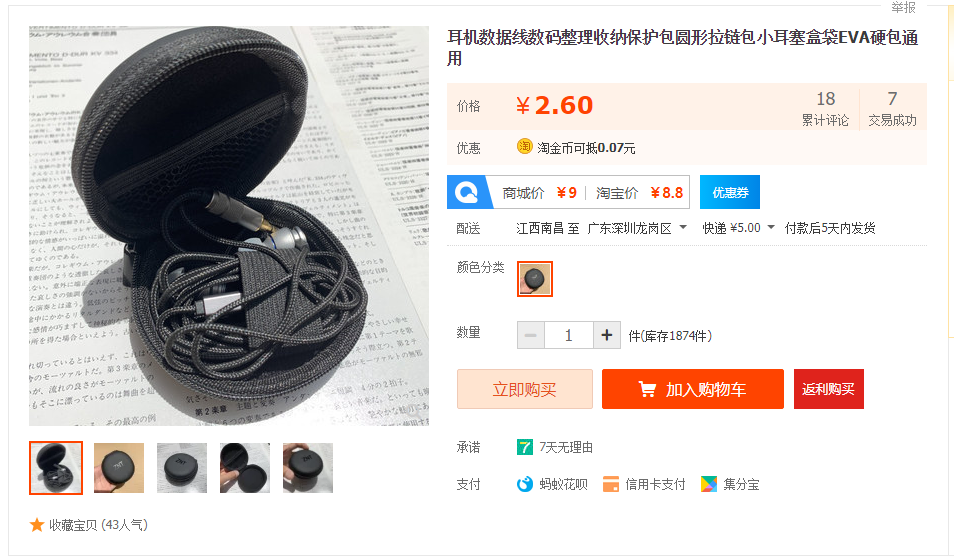 圆形硬壳拉链收纳包,两面硬包,直径8cm,厚度3.5cm左右,装下2条小耳机不成问题,也可以用来装内存卡,数据线,耳机等等小物件。有蓝色白边,黑色红边两种颜色,带有快挂挂钩,可以挂在背包之类外面,质量不错,可以多买几个备用。