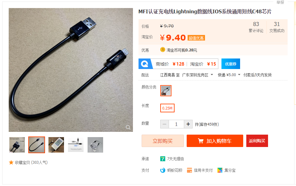 这条经过MFi认证的Lightning数据线是一条25cm长的短线,采用通用的C48原装芯片,充电快速稳定,过2.4A不弹窗,可以为iPhone5以来的苹果手机以及iPad等服务,适合充电宝充手机携带方便。线材为黑色,经过12000次折弯测试的线,耐用性还不错。包装为袋装。