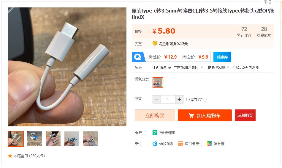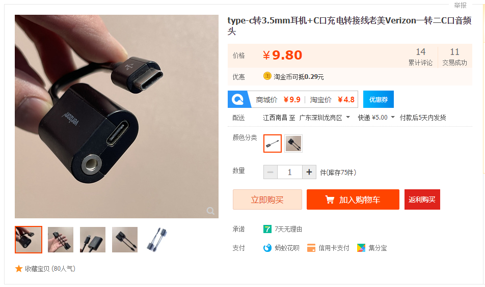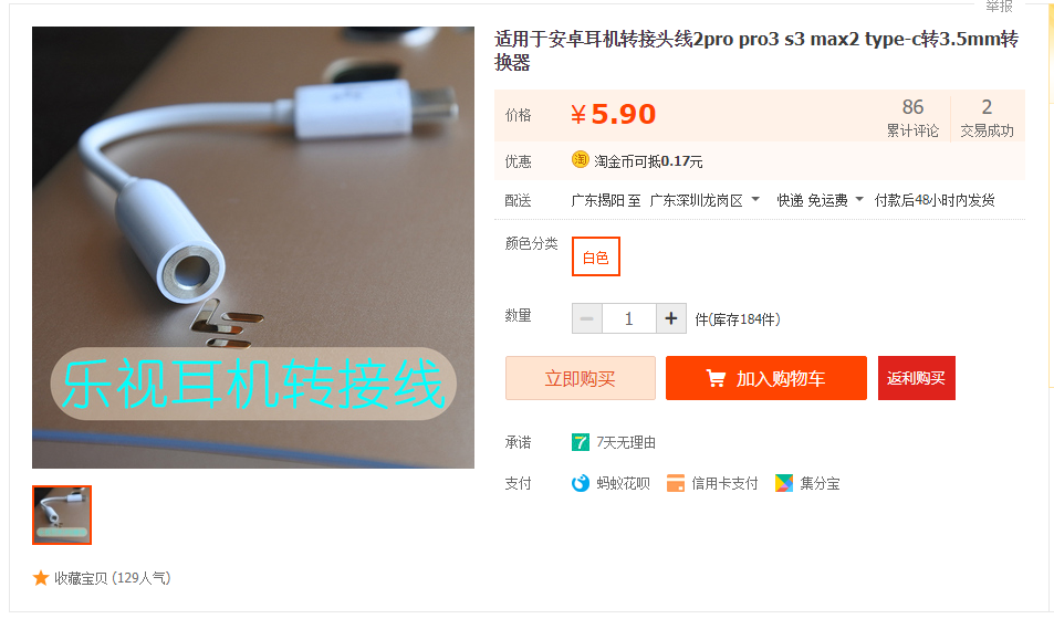 当下新机大多取消了3.5mm耳机插口,只留了一个Type-c接口。因此,如果要用3.5mm耳机插头来插入手机听声的话,就必须通过耳机转接头才能插入手机上的充电、数据线孔。乐视这款USB-C to 3.5mm耳机转接线就挺合适,大厂出品,价格美丽,喜欢用耳机的朋友多买几个备用总是好的。