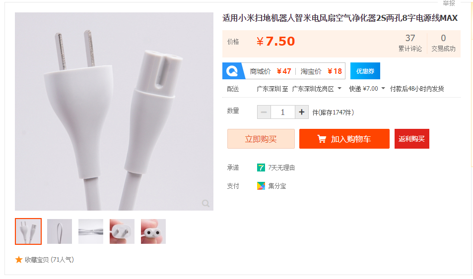 这条8字电源线为某米原装出品,适用于小米扫地机器人、智米电风扇、空气净化器2S等小米设备两孔系列所有产品,长度约1.5m,无氧铜纯铜线芯,线芯直径约为2*0.75mm。