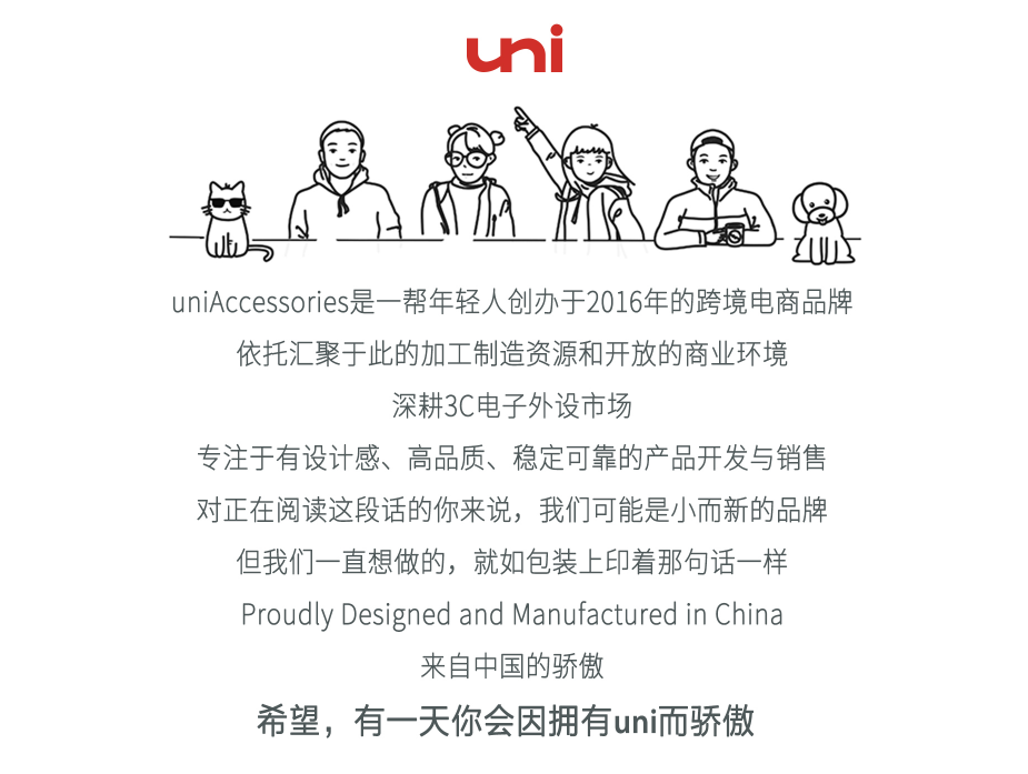 uniAccessories是一家起步于深圳的创业公司,利用这里全球领先的加工制造资源和开放的商业环境,深耕 USB-C 配件市场,坚持专注于有设计感、高品质、稳定可靠的产品开发,我们的产品已经获得了广大海外( 美欧日)消费者的认可与肯定。今天终于带着历经打磨的最佳产品回到中国,在配件市场为中国消费者带来多一种优质选择。