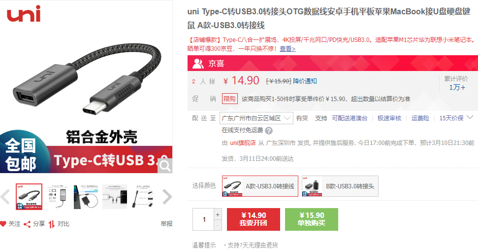 uni的这款转接头有两种款式,分别是转接线和转接头,功能上没有差别,都是用来转接的。速度方面,USB 3.0协议,5Gbps数据带宽(550M/S),也就是目前第三快吧,在这个价位。非常不错了。