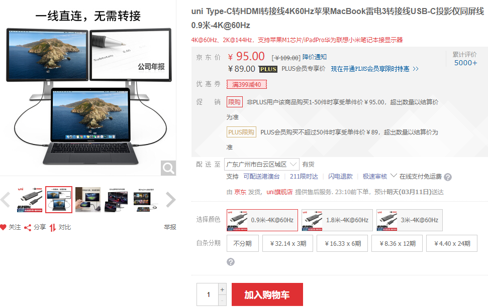 这条Type-C转HDMI转接线有三种长度,分别是0.9米、1.8米和3米,适合各种场景,越长越贵。
