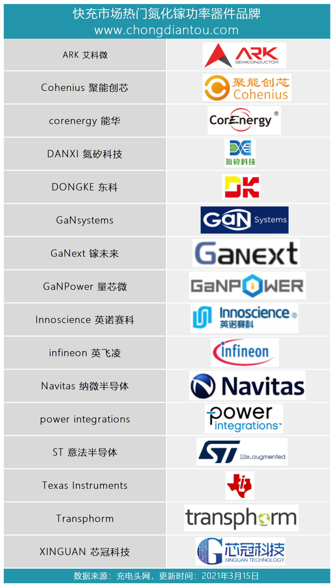 面对日益增长的快充市场,全球范围内已有纳微、PI、英诺赛科、英飞凌、意法半导体、Texas Instruments、GaNsystems、艾科微、聚能创芯、东科半导体、氮矽科技、镓未来、量芯微、Transphorm、能华、芯冠科技等16家氮化镓功率芯片供应商。