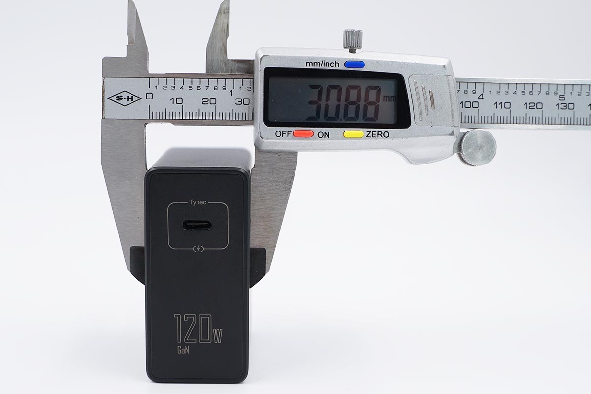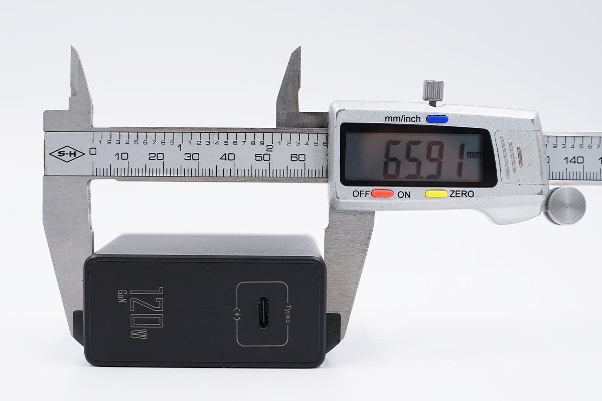 由此可以得到充电器的三维参数为54.07x65.91x30.88mm,体积为110.04cm³,以最高输出120W计算,功率密度约为1.09W/cm³ ,作为一款标配的120W氮化镓充电器,这样的功率密度数值很漂亮。