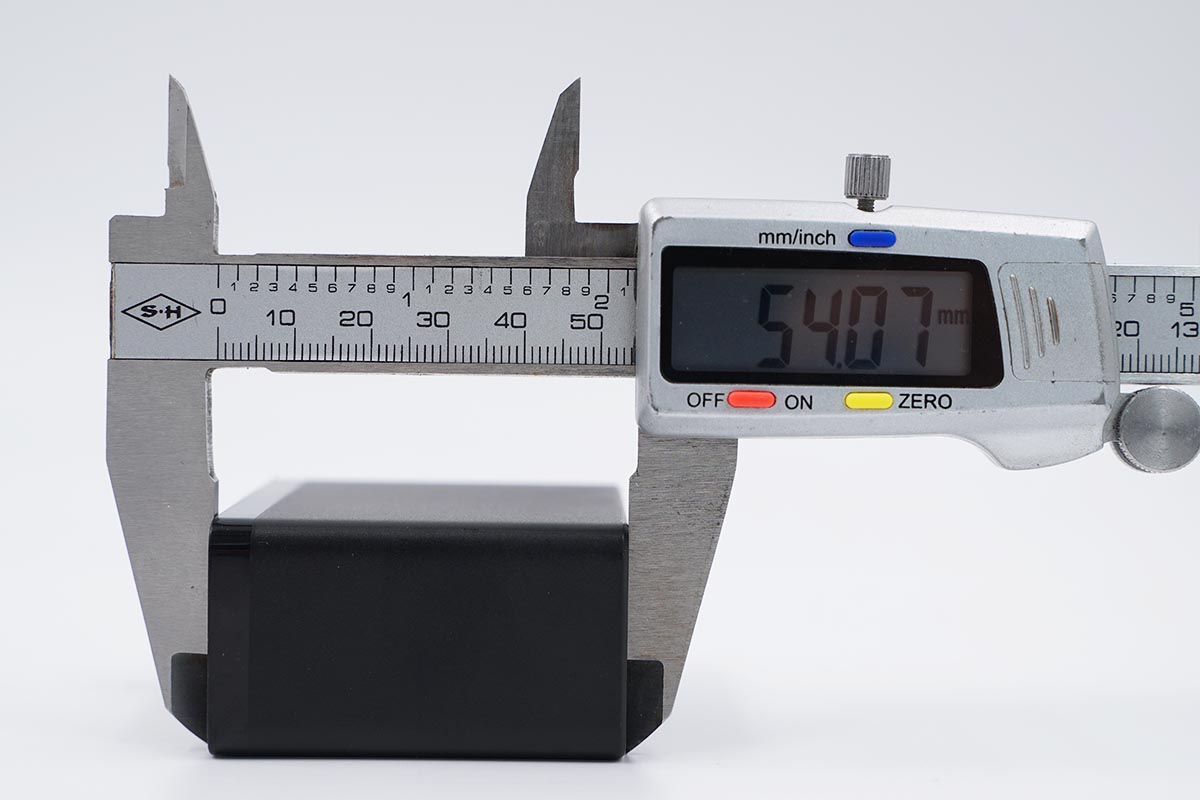 使用卡尺实测充电器不算插脚的宽度约为54.07mm。