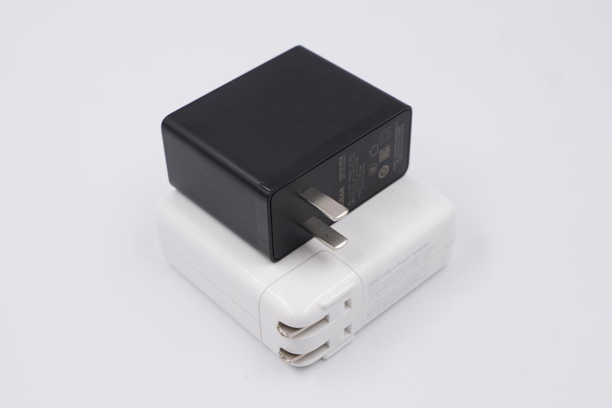 和苹果96W充电器整体对比一下,可以很直观的感觉出腾讯红魔6 Pro的小巧。